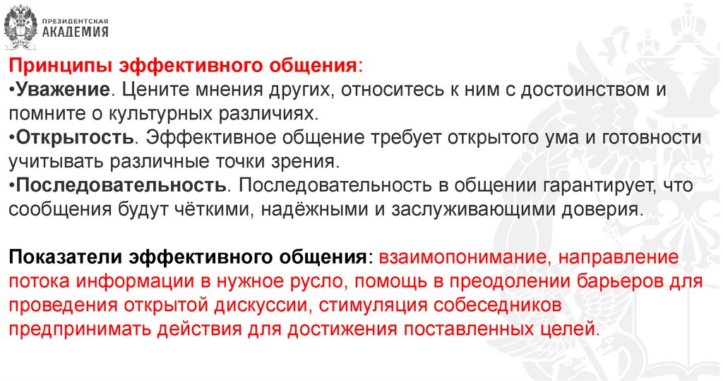 Принципы эффективного общения:•Уважение. Цените мнения других, относитесь к ним с достоинством и