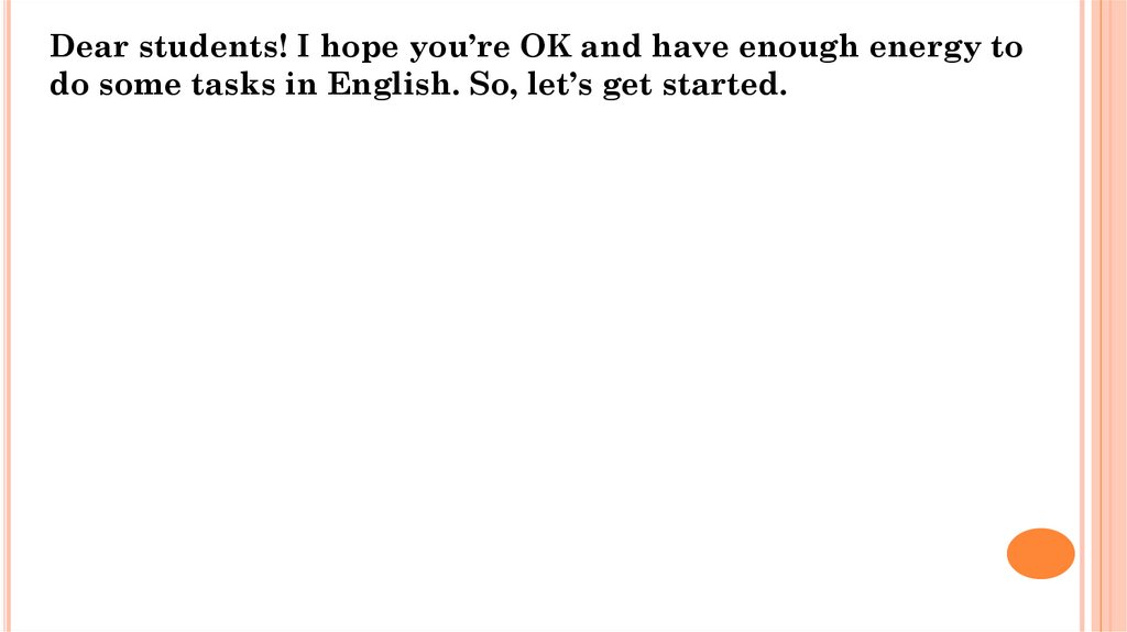 Dear students! I hope you’re OK and have enough energy todo some tasks in English. So, let’s get started.