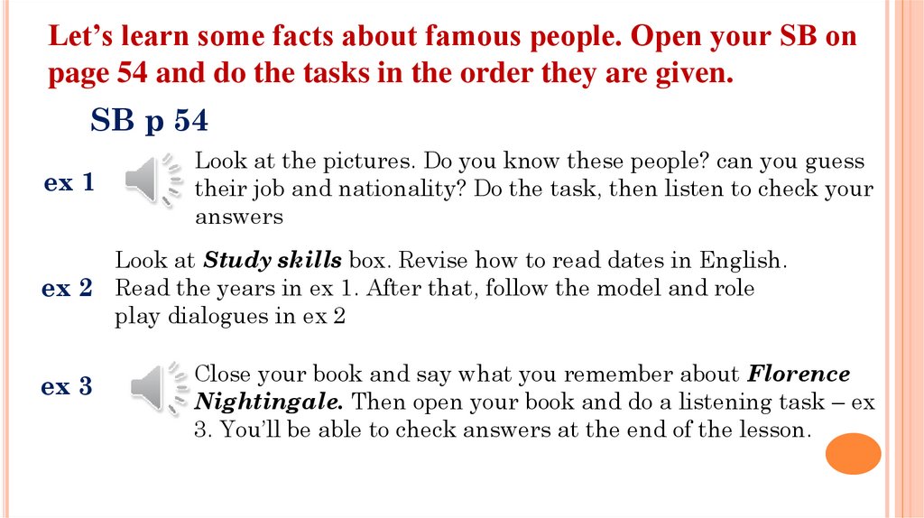 Let’s learn some facts about famous people. Open your SB onpage 54 and do the tasks in the order they are given.
