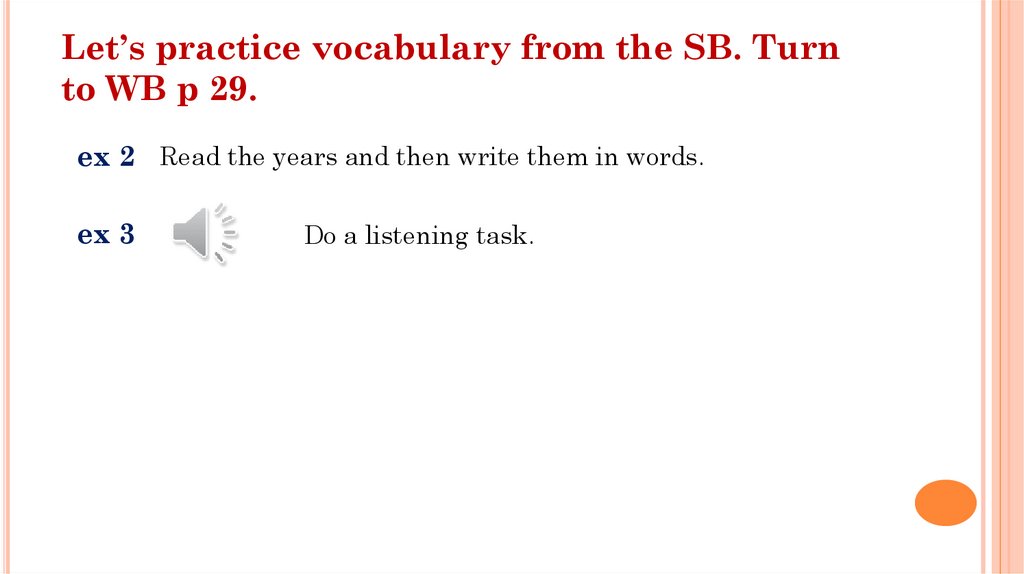 Let’s practice vocabulary from the SB. Turnto WB p 29.