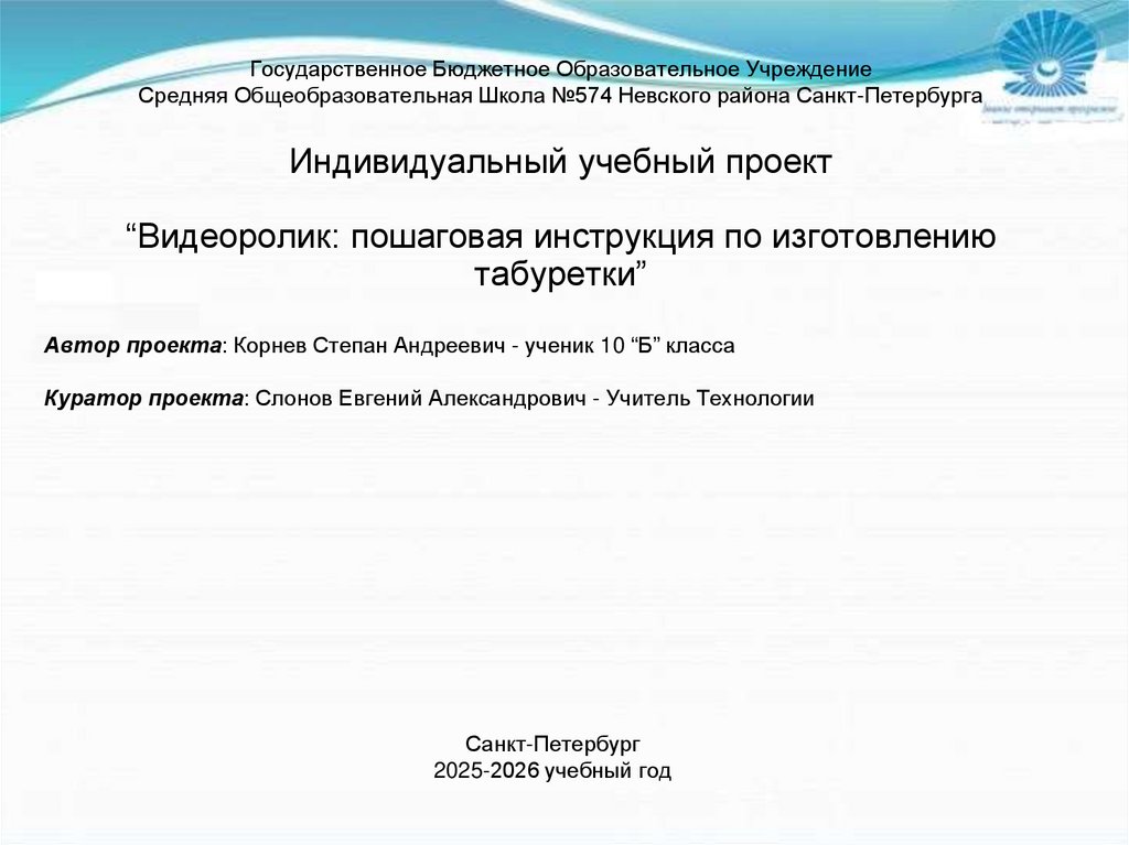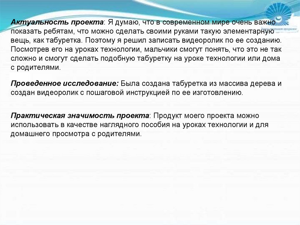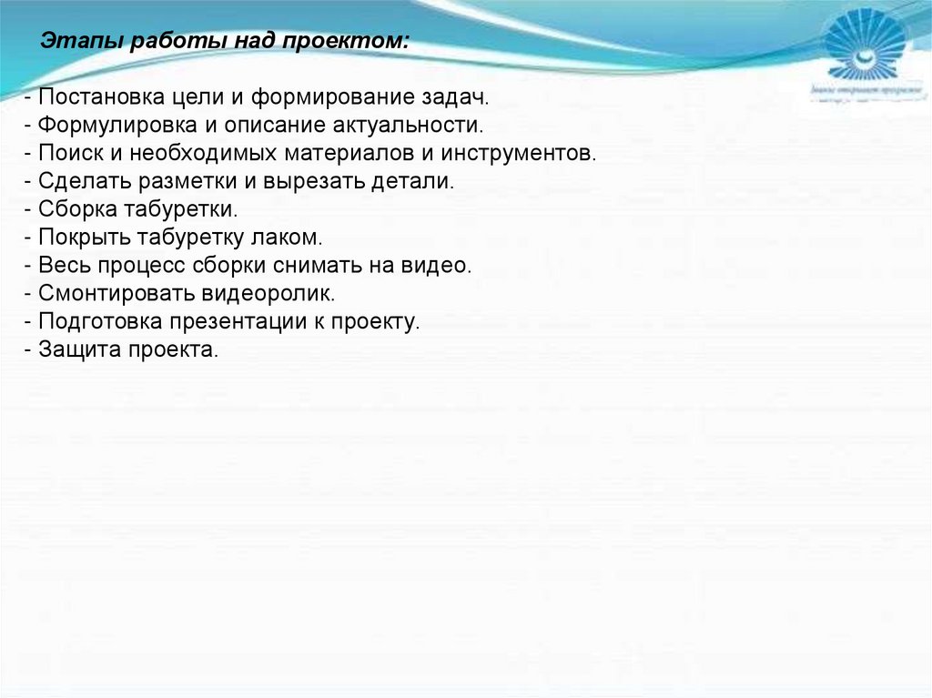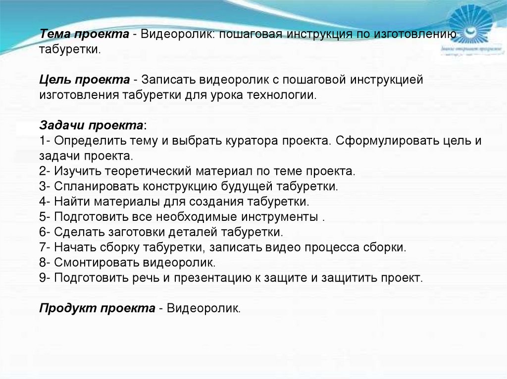 Тема проекта - Видеоролик: пошаговая инструкция по изготовлениютабуретки.