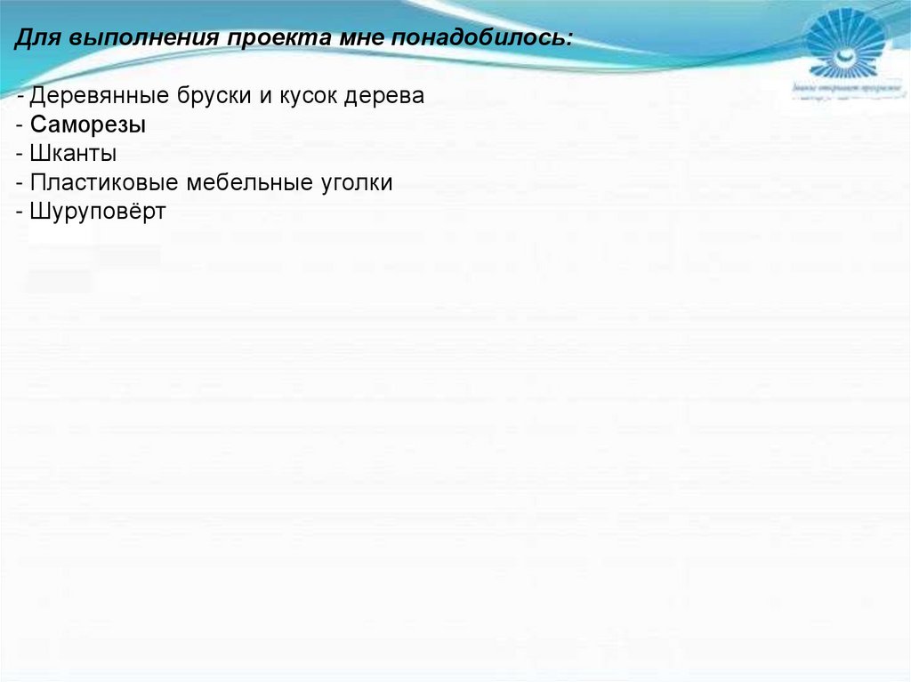 Для выполнения проекта мне понадобилось:- Деревянные бруски и кусок дерева