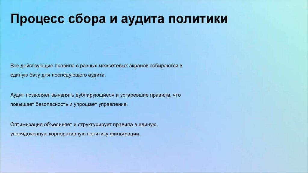 Аудит позволяет выявлять дублирующиеся и устаревшие правила, что