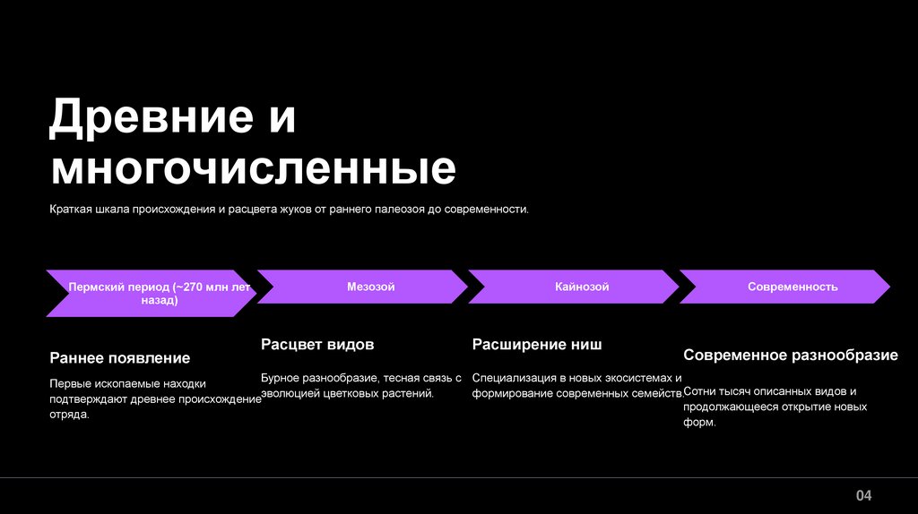 Краткая шкала происхождения и расцвета жуков от раннего палеозоя до современности.