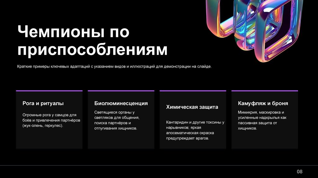 Краткие примеры ключевых адаптаций с указанием видов и иллюстраций для демонстрации на слайде.