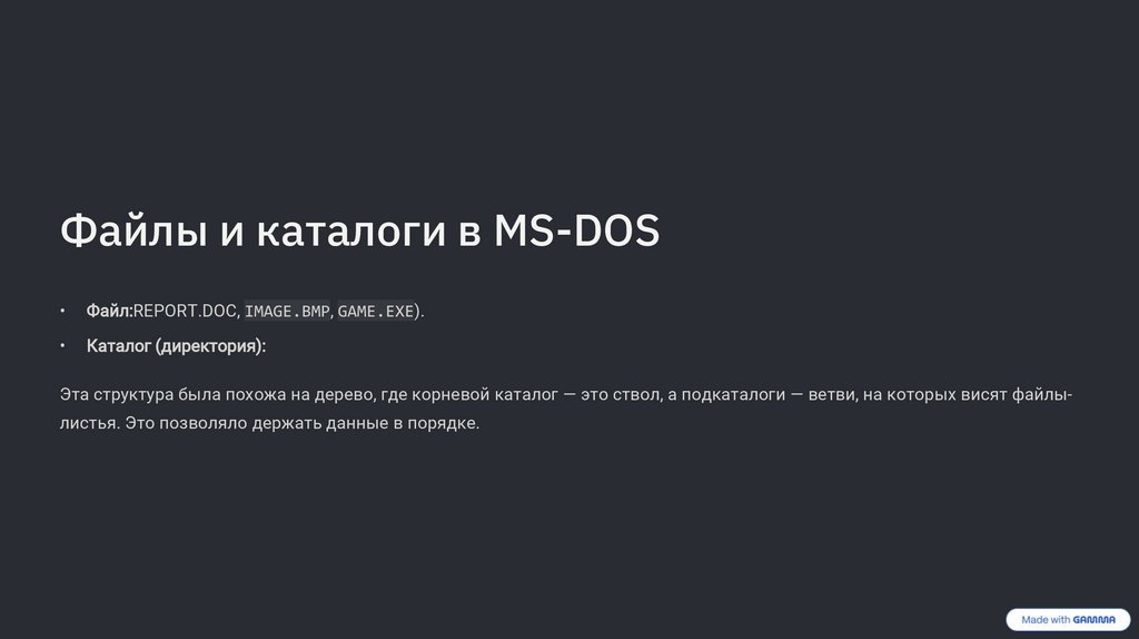 Файлы и каталоги в MS-DOSФайл:REPORT.DOC, IMAGE.BMP, GAME.EXE).