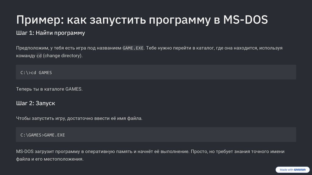 Предположим, у тебя есть игра под названием GAME.EXE. Тебе нужно перейти в каталог, где она находится, используя