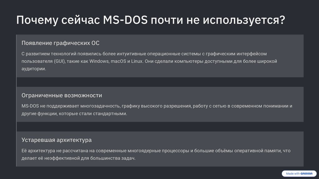 MS-DOS не поддерживает многозадачность, графику высокого разрешения, работу с сетью в современном понимании и
