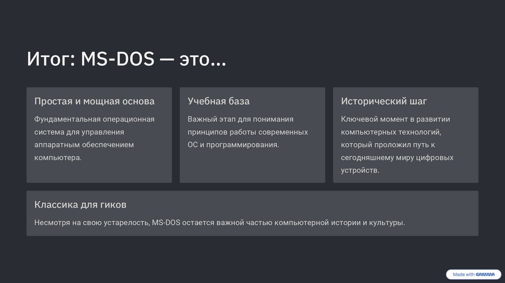 Несмотря на свою устарелость, MS-DOS остается важной частью компьютерной истории и культуры.