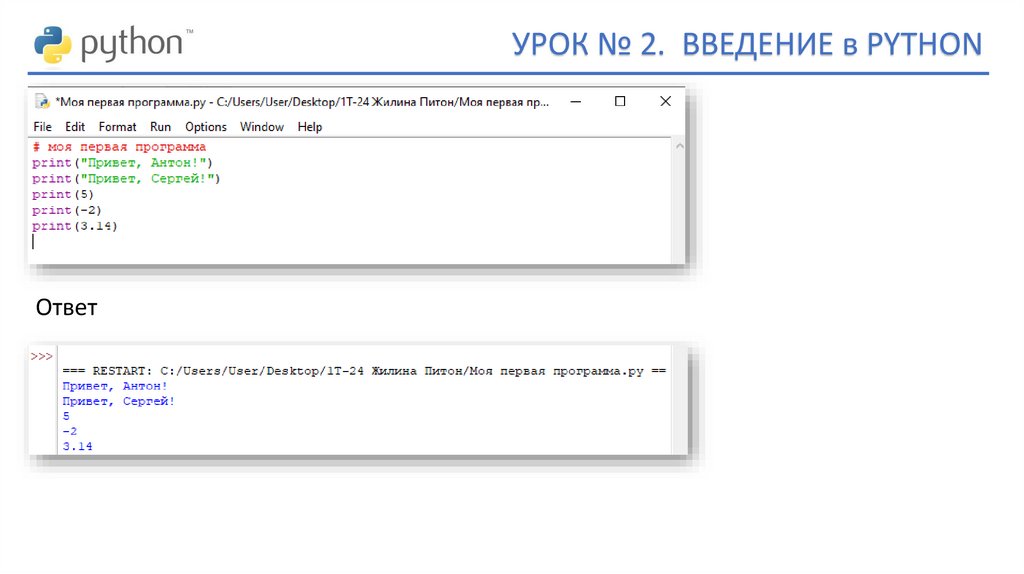 УРОК № 2. ВВЕДЕНИЕ в PYTHONПрограммы на языке Python чаще всего выполняются в