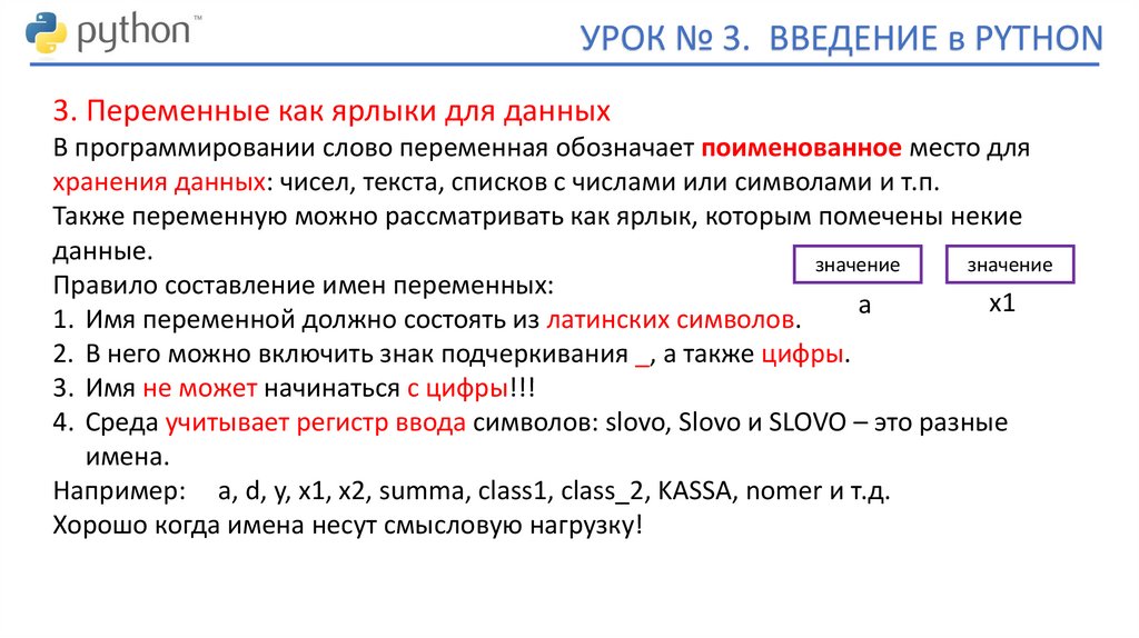 УРОК № 3. ВВЕДЕНИЕ в PYTHON3. Переменные как ярлыки для данных