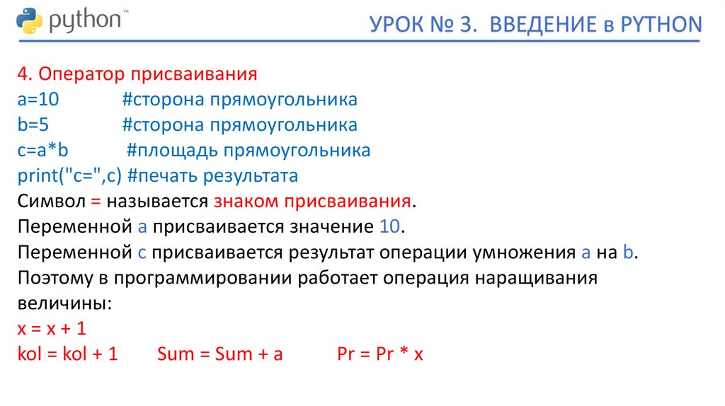 УРОК № 3. ВВЕДЕНИЕ в PYTHON4. Оператор присваивания