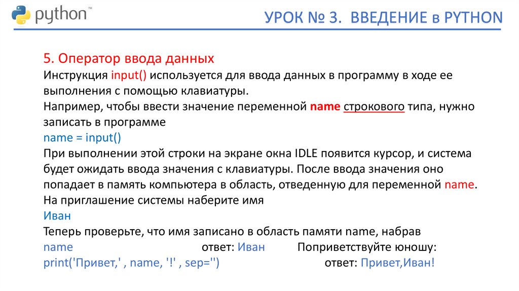 УРОК № 3. ВВЕДЕНИЕ в PYTHON5. Оператор ввода данных