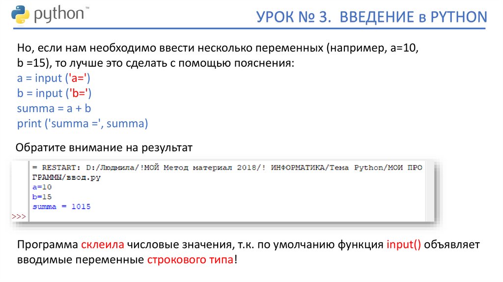 УРОК № 3. ВВЕДЕНИЕ в PYTHONНо, если нам необходимо ввести несколько переменных (например, а=10,