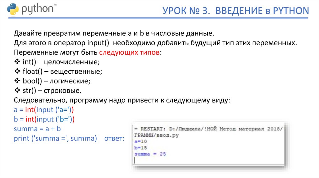 УРОК № 3. ВВЕДЕНИЕ в PYTHONДавайте превратим переменные а и b в числовые данные.
