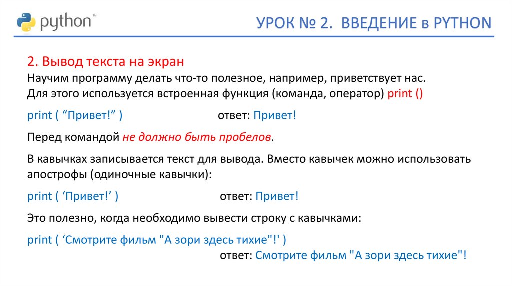 УРОК № 2. ВВЕДЕНИЕ в PYTHON2. Вывод текста на экран