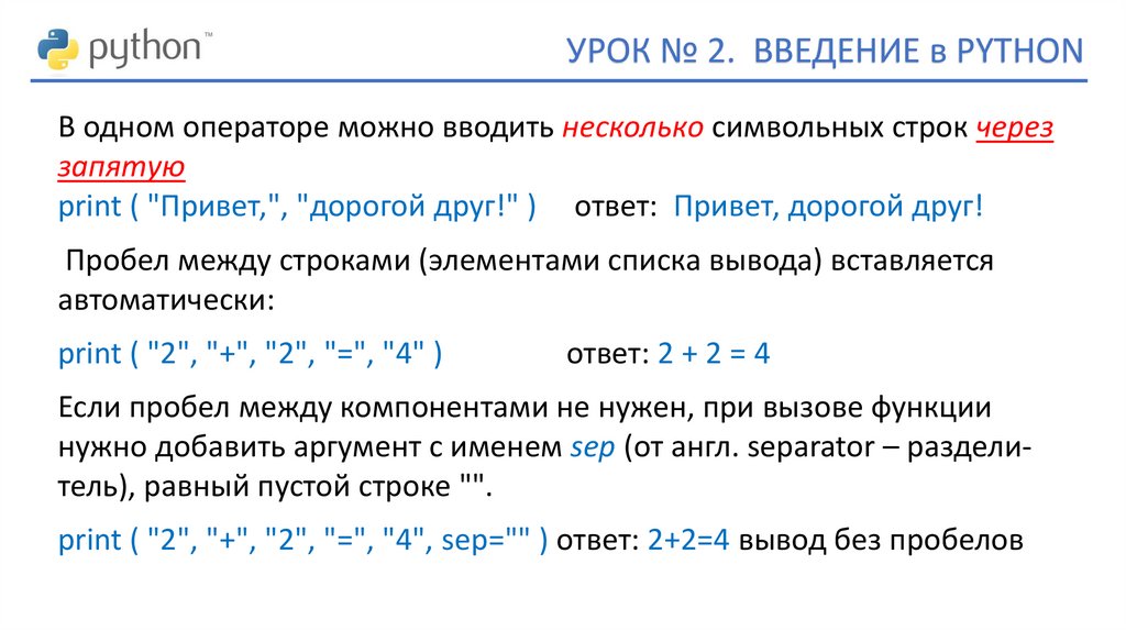 УРОК № 2. ВВЕДЕНИЕ в PYTHONВ одном операторе можно вводить несколько символьных строк через