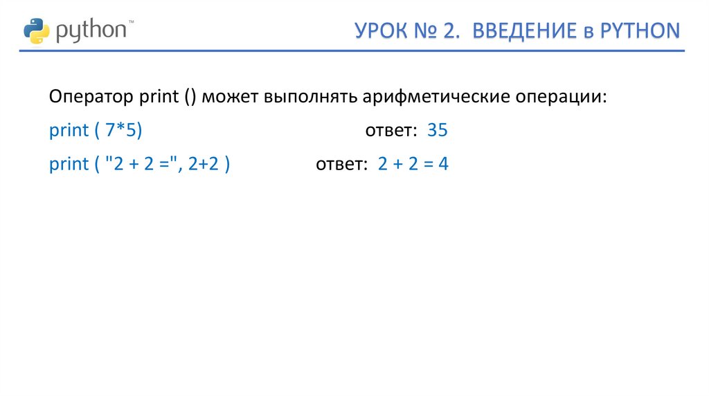 УРОК № 2. ВВЕДЕНИЕ в PYTHONОператор print () может выполнять арифметические операции: