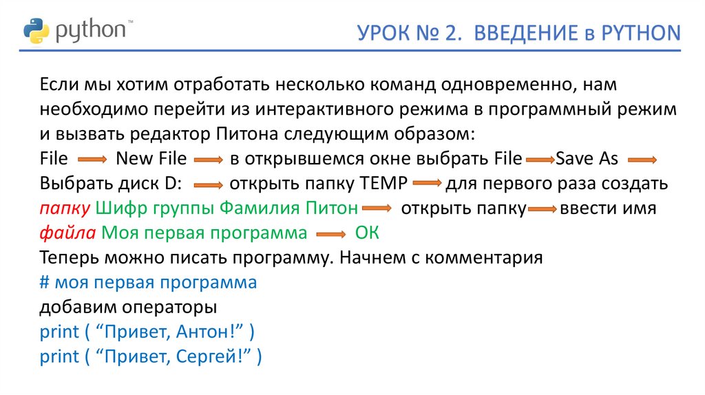 УРОК № 2. ВВЕДЕНИЕ в PYTHONЕсли мы хотим отработать несколько команд одновременно, нам