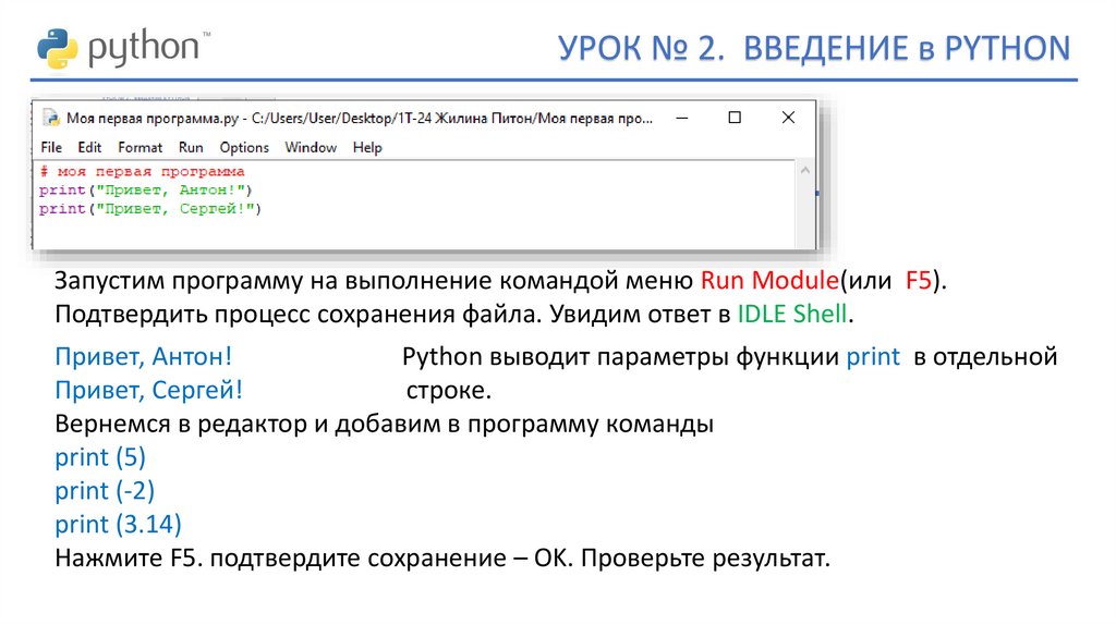 УРОК № 2. ВВЕДЕНИЕ в PYTHONЗапустим программу на выполнение командой меню Run Module(или F5).