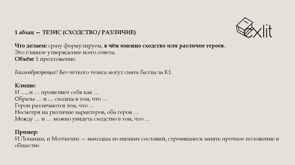 1 абзац — ТЕЗИС (СХОДСТВО / РАЗЛИЧИЕ)Что делаем: сразу формулируем, в чём именно сходство или различие героев.