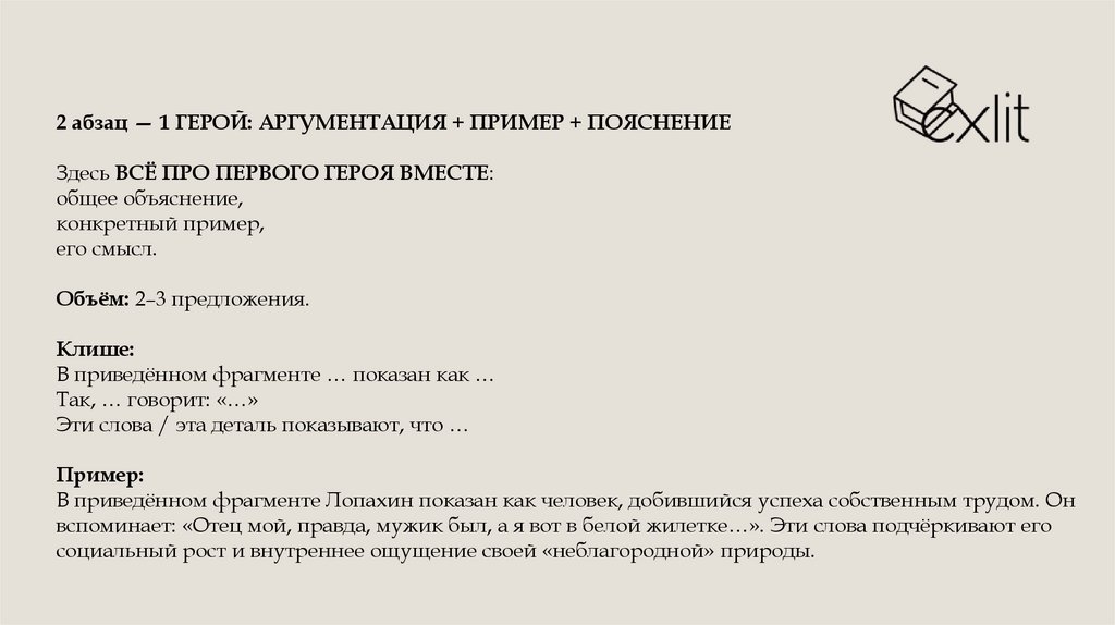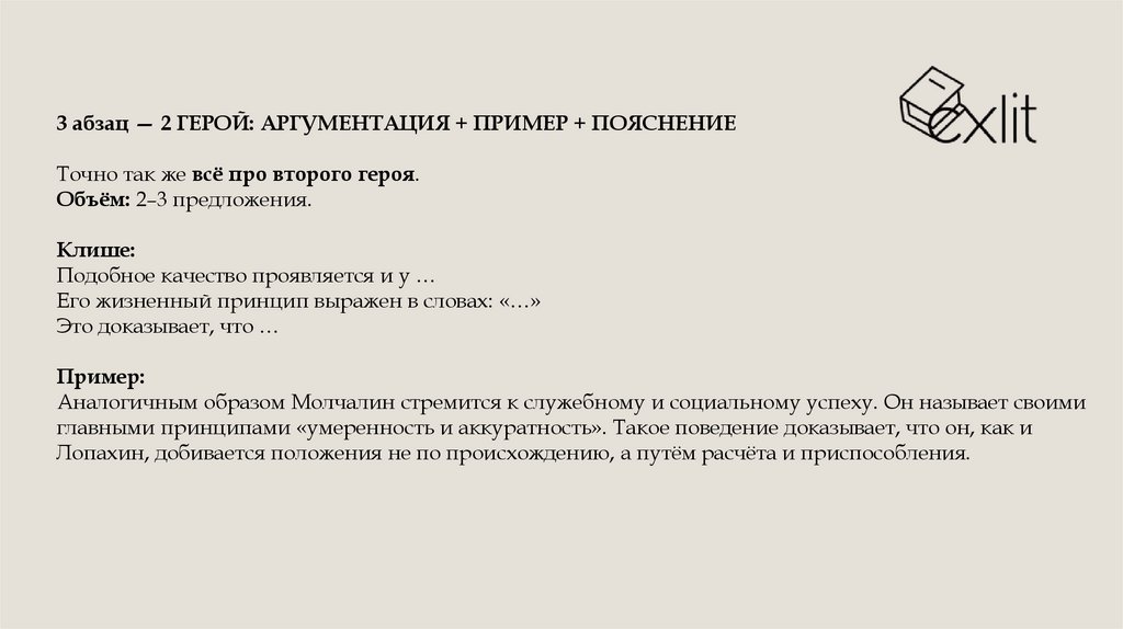3 абзац — 2 ГЕРОЙ: АРГУМЕНТАЦИЯ + ПРИМЕР + ПОЯСНЕНИЕТочно так же всё про второго героя.