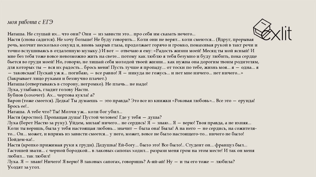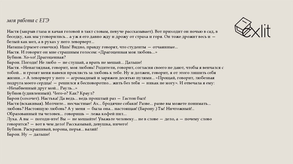 моя работа с ЕГЭНастя (закрыв глаза и качая головой в такт словам, певуче рассказывает). Вот приходит он ночью в сад, в