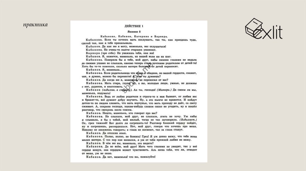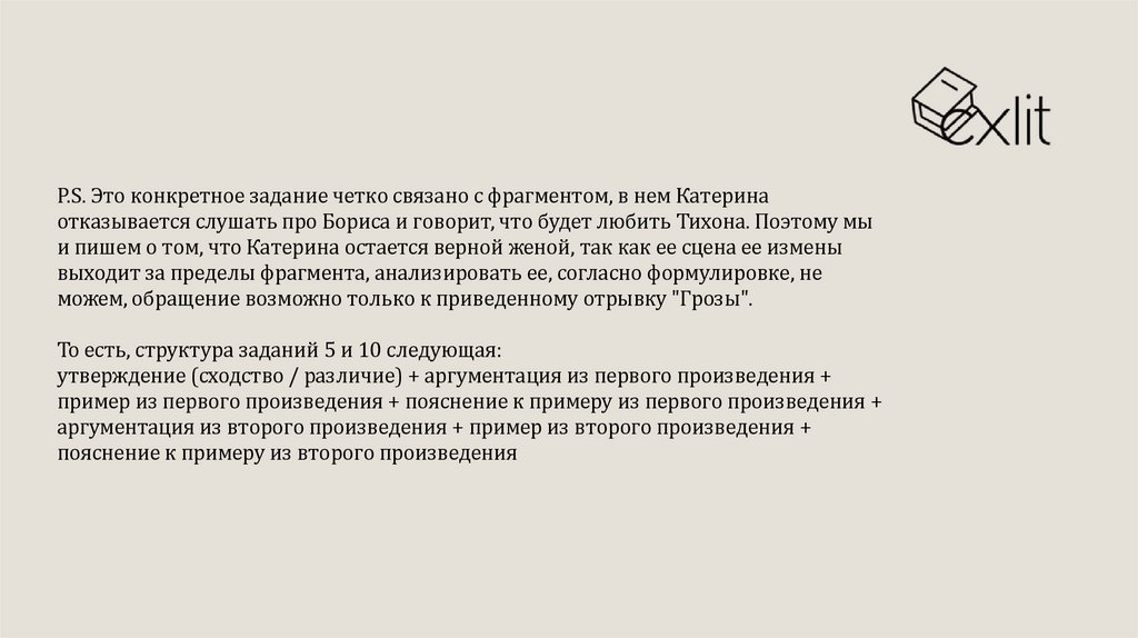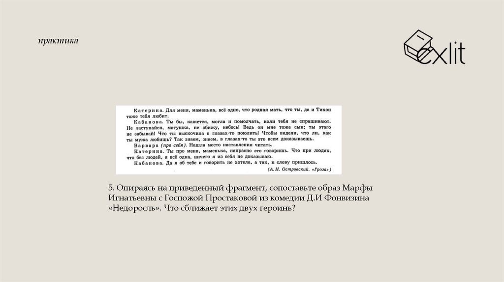P.S. Это конкретное задание четко связано с фрагментом, в нем Катеринаотказывается слушать про Бориса и говорит, что будет любить Тихона. Поэтому мы