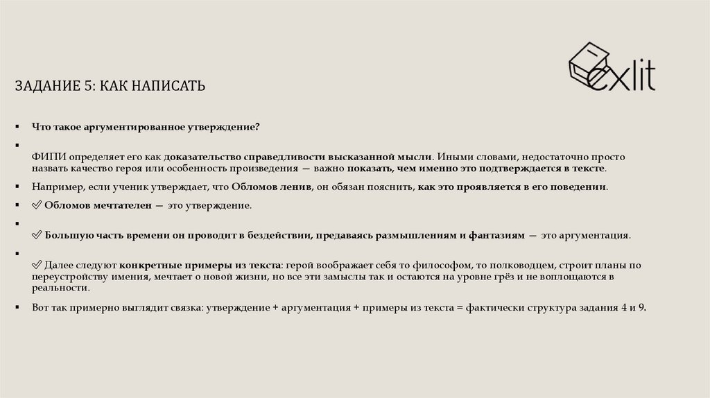 Вот так примерно выглядит связка: утверждение + аргументация + примеры из текста = фактически структура задания 4 и 9.