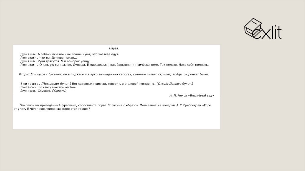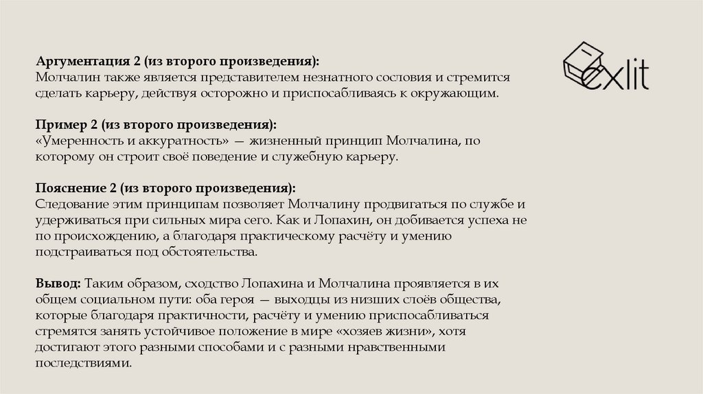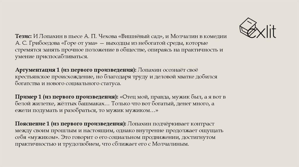 Тезис: И Лопахин в пьесе А. П. Чехова «Вишнёвый сад», и Молчалин в комедииА. С. Грибоедова «Горе от ума» — выходцы из небогатой среды, которые
