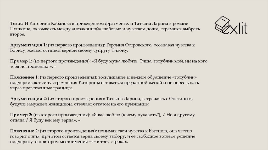 Тезис: И Катерина Кабанова в приведенном фрагменте, и Татьяна Ларина в романеПушкина, оказываясь между «незаконной» любовью и чувством долга, стремятся выбрать