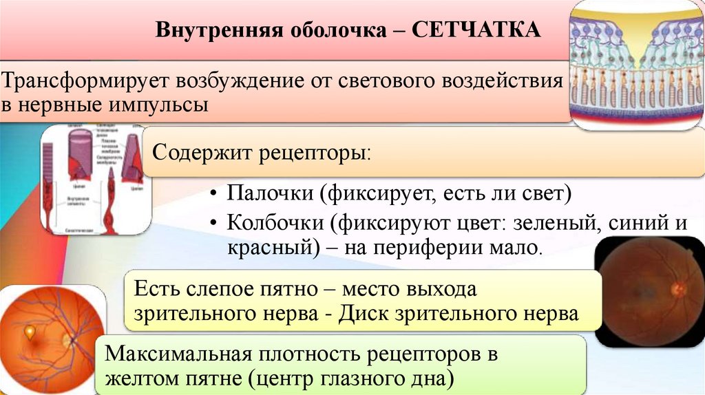 Внутренняя оболочка – СЕТЧАТКАТрансформирует возбуждение от светового воздействия