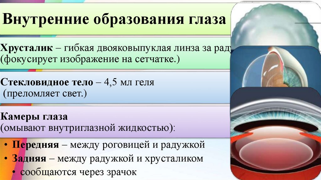 Внутренние образования глазаХрусталик – гибкая двояковыпуклая линза за радужкой