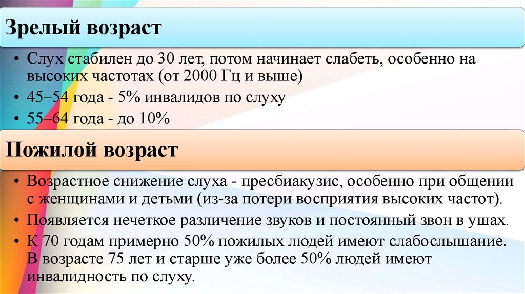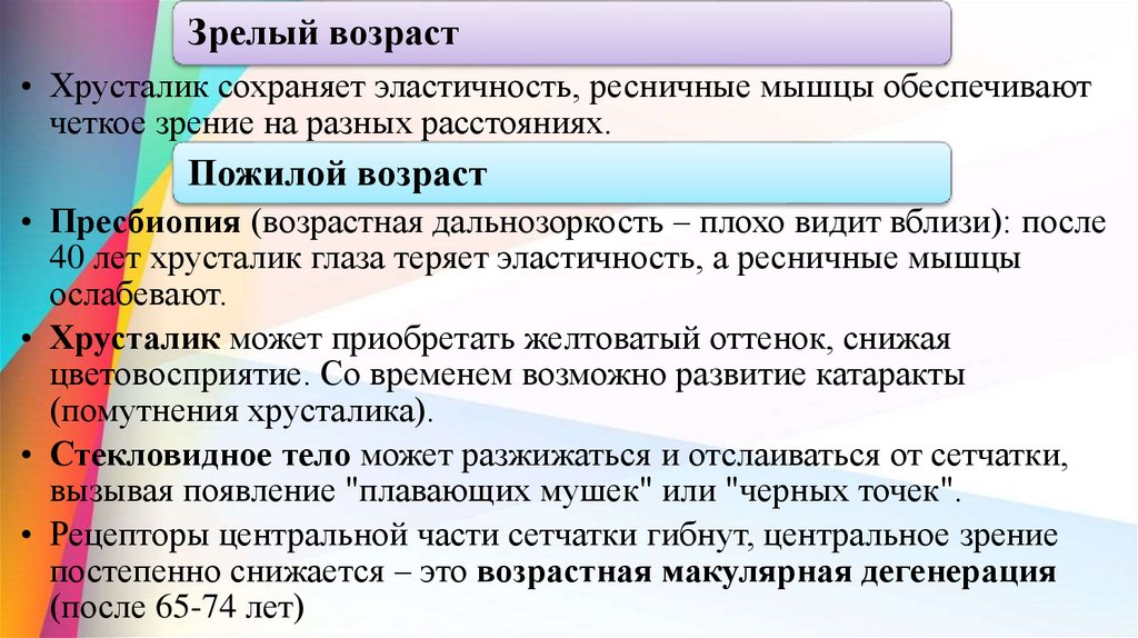 • Зрение: Ухудшается аккомодация (способность фокусироваться на близкихобъектах, пресбиопия), снижается острота зрения, темновая адаптация, могут