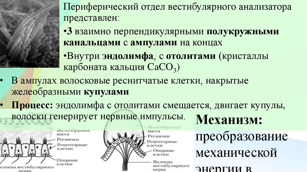• Процесс: эндолимфа с отолитами смещается, двигает купулы,