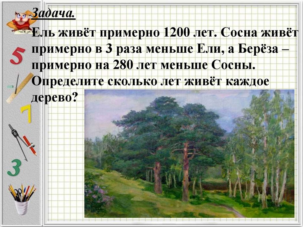 Задача.Ель живёт примерно 1200 лет. Сосна живёт