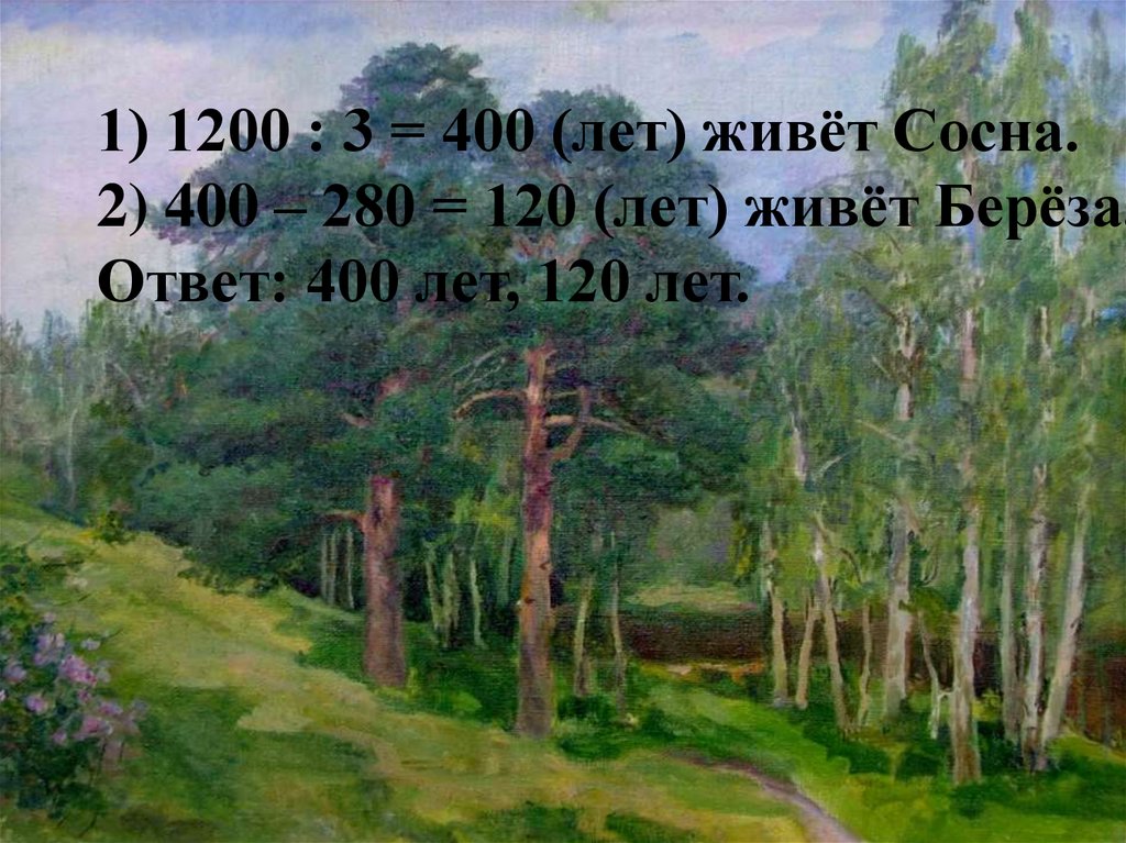 1) 1200 : 3 = 400 (лет) живёт Сосна.2) 400 – 280 = 120 (лет) живёт Берёза.