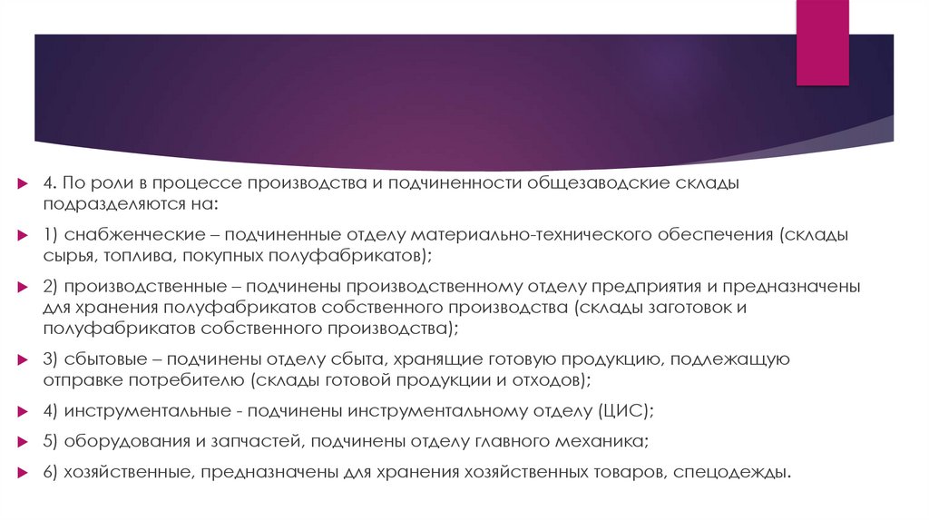 4. По роли в процессе производства и подчиненности общезаводские складыподразделяются на: