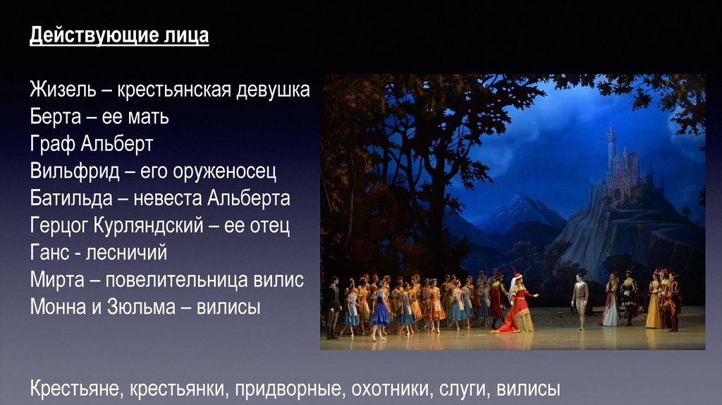 Крестьяне, крестьянки, придворные, охотники, слуги, вилисы