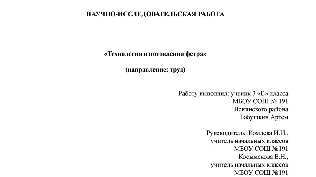 НАУЧНО-ИССЛЕДОВАТЕЛЬСКАЯ РАБОТА«Технология изготовления фетра»
