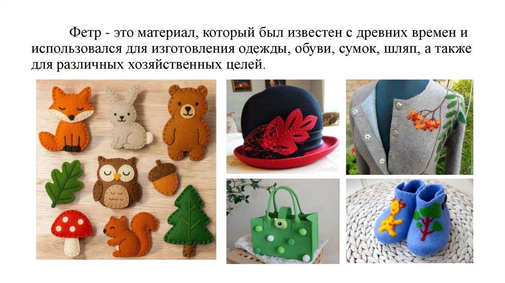 Фетр - это материал, который был известен с древних времен ииспользовался для изготовления одежды, обуви, сумок, шляп, а также