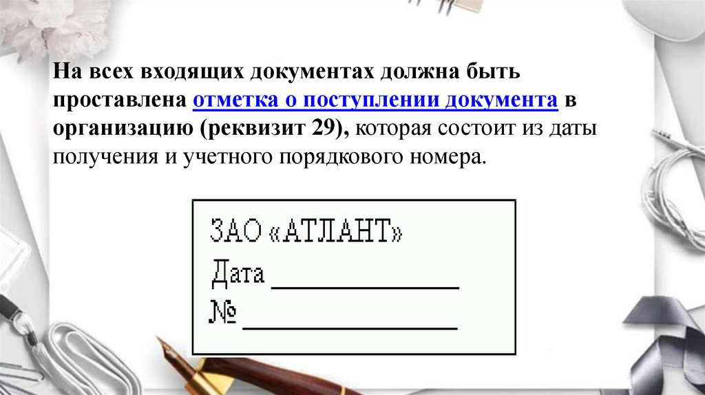 На всех входящих документах должна бытьпроставлена отметка о поступлении документа в