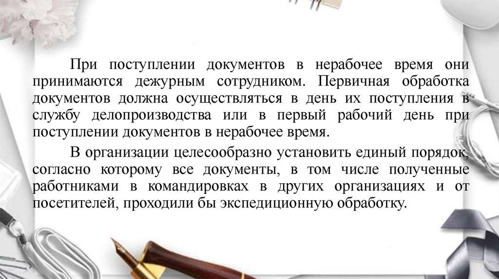 При поступлении документов в нерабочее время онипринимаются дежурным сотрудником. Первичная обработка