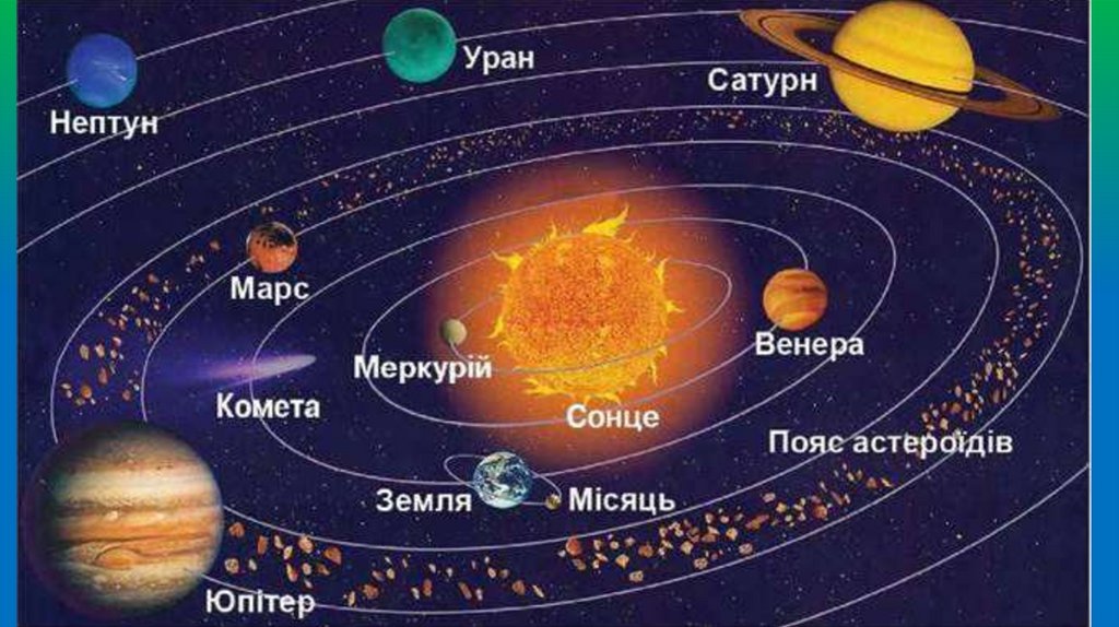 • До складу Сонячної системи входить 8 великих планет: Меркурій, Венера,