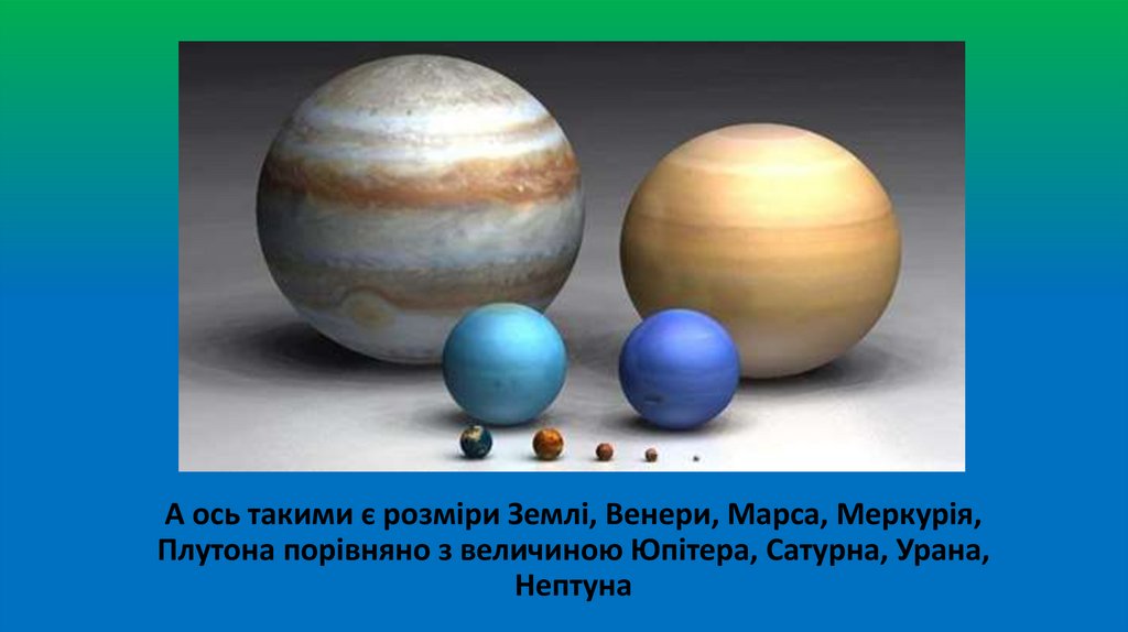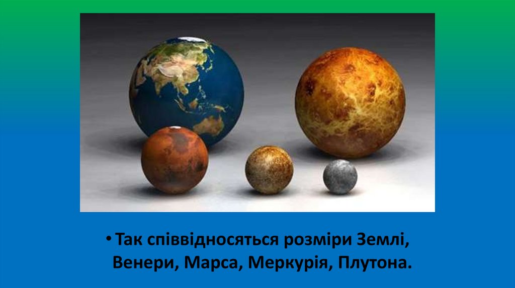 • Так співвідносяться розміри Землі,Венери, Марса, Меркурія, Плутона.