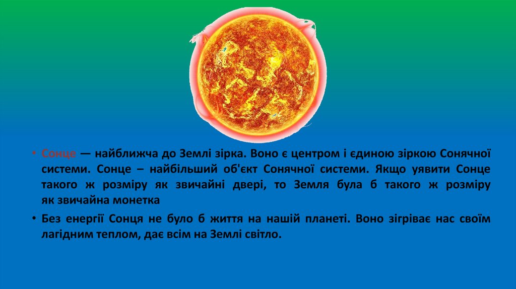 • Сонце — найближча до Землі зірка. Воно є центром і єдиною зіркою Сонячноїсистеми. Сонце – найбільший об'єкт Сонячної системи. Якщо уявити Сонце