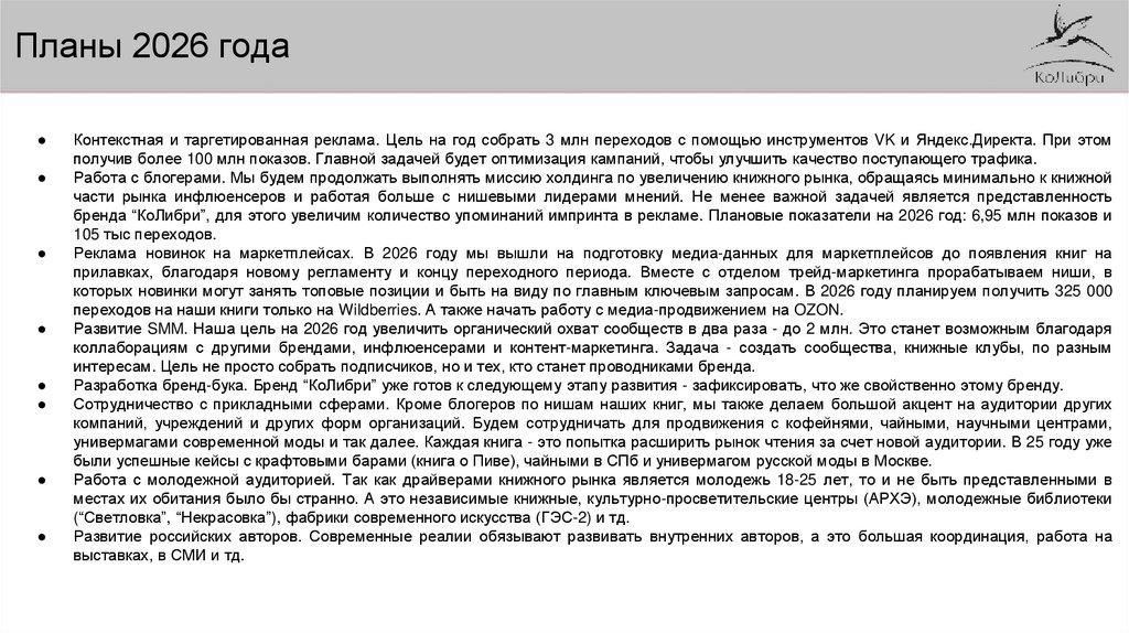 бренда “КоЛибри”, для этого увеличим количество упоминаний импринта в рекламе. Плановые показатели на 2026 год: 6,95 млн показов и