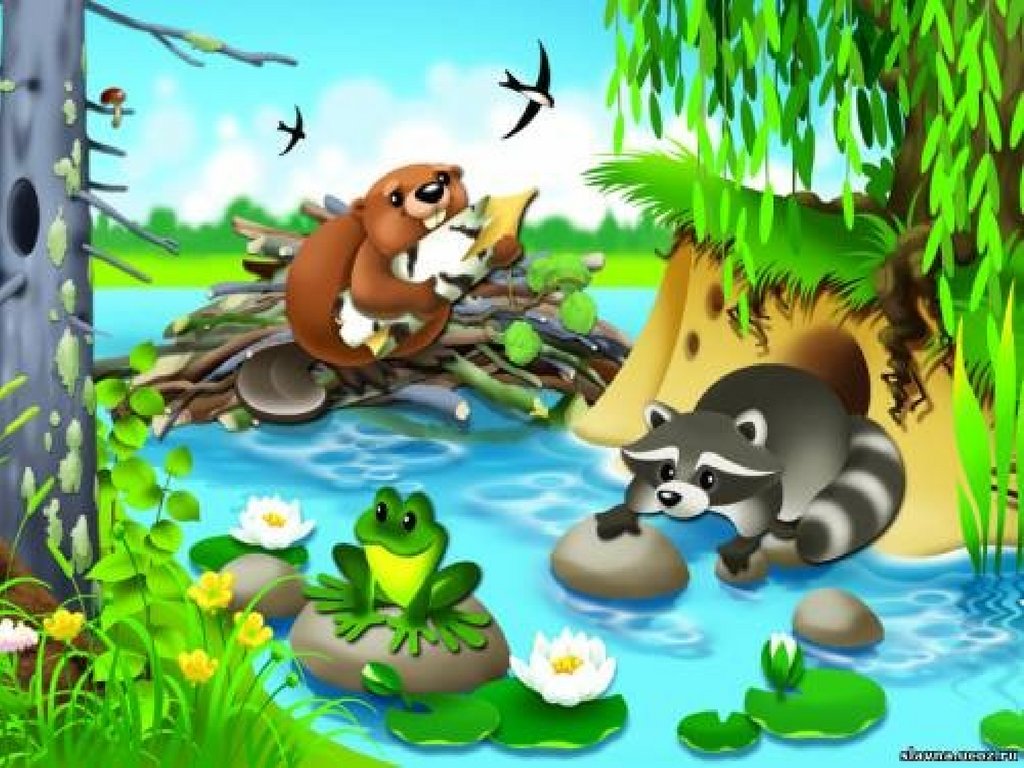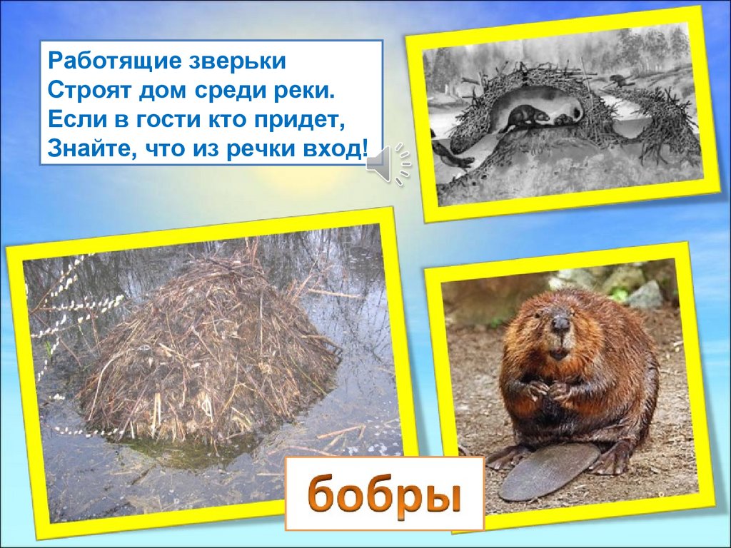 Работящие зверькиСтроят дом среди реки.