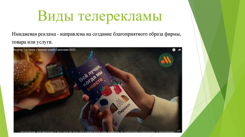 Виды телерекламыИмиджевая реклама - направлена на создание благоприятного образа фирмы,
