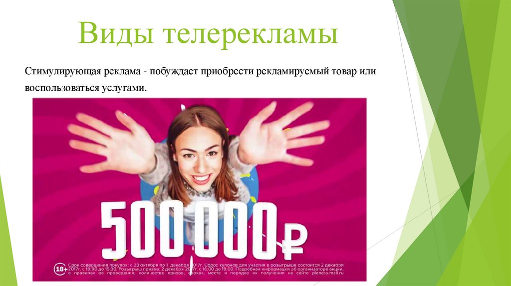 Виды телерекламыСтимулирующая реклама - побуждает приобрести рекламируемый товар или